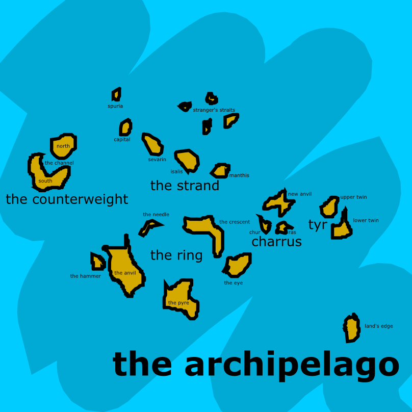 Tyr is a Norse god. Sevarin is almost from The Name of the Wind The Counterweight (continent) is from discworld The Archipelago is from Earthsea Charrus is from the Mass Effect character Stranger's Straits is named after the quark (this one was conscious though.) The names in The Ring are strongly influenced by Bastion.
