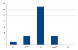 How about movie rating? I'm too slack to actually go through and sort them into genres, but this might give us some idea of what type of stuff we're watching, right?