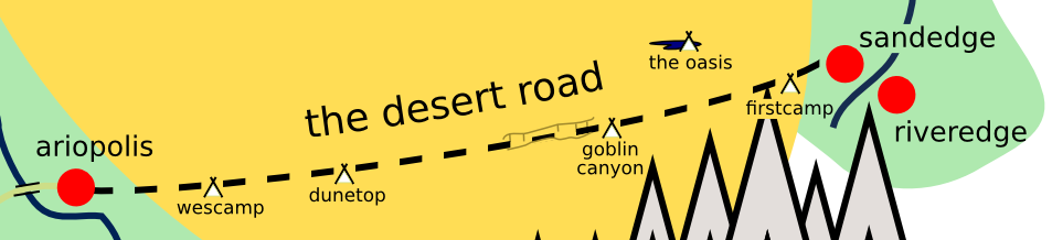 While there's actually plenty of scope for adventuring elsewhere, the bulk of the Fun Stuff happens in the desert, and more specifically on the road through it. This is logical - the desert is frickin' huge and the road is where most people come into contact with it.