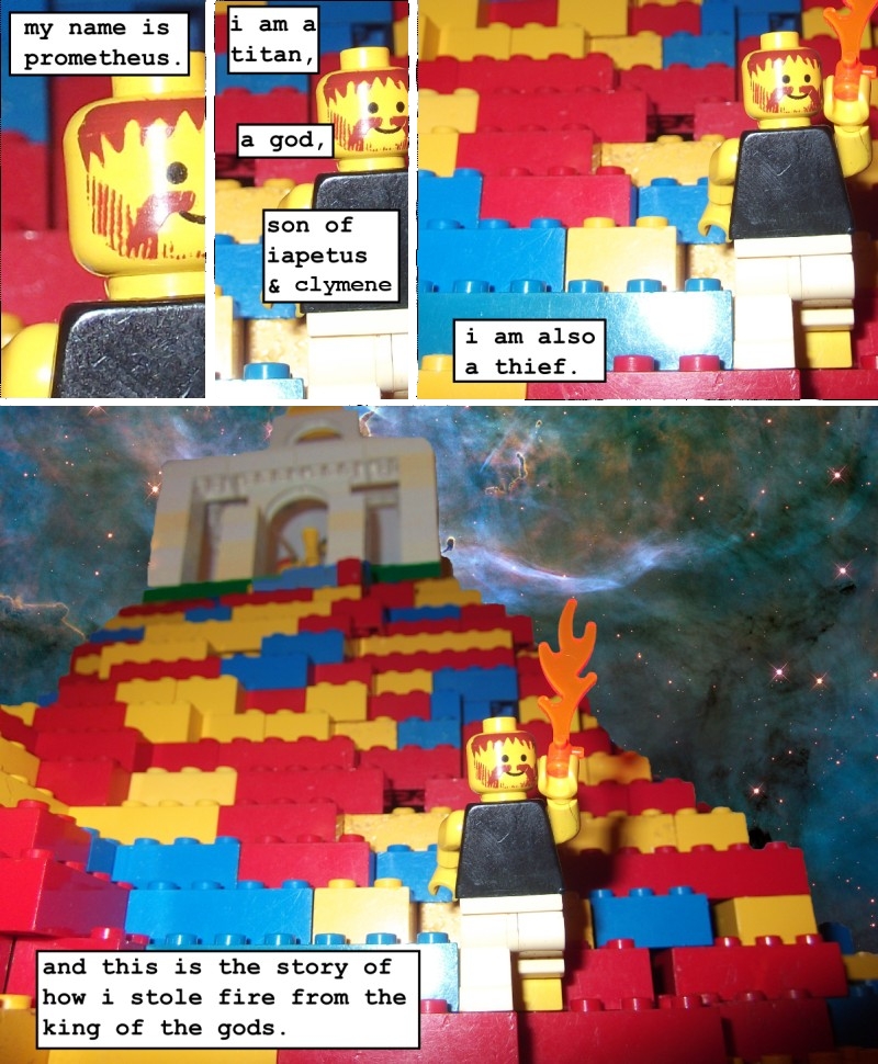 Typically for Greek myth, there are several differing stories of Prometheus' parentage. In Hesiod's Theogony, he is the son of Iapetos and the sea-nymph, Clymene, which is the version I've used here. In Aeschlyus' Prometheus Bound, the other major version of the myth, he is named simply as the 'son of Themis', a female Titan, with no father given - presumably either Iapetos (her brother) or Zeus (as king of the gods).