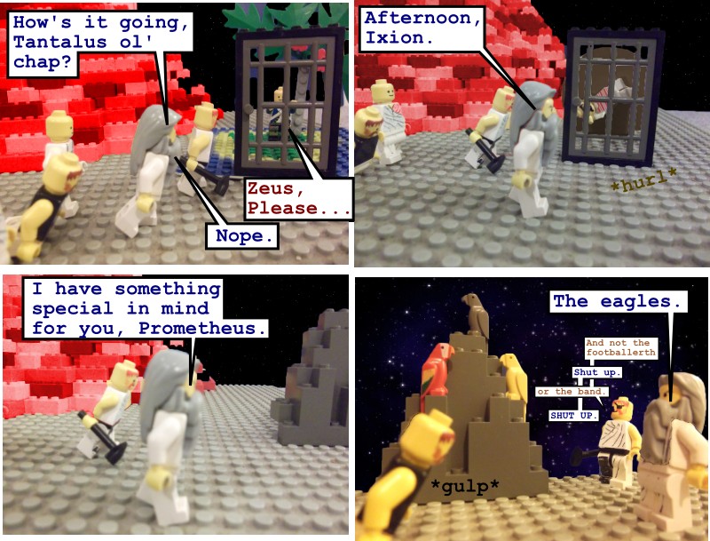 Contrary to perception, the punishments seen here (as well as that of Sisyphus, which alas proved too difficult to portray in Lego) weren't actually anything to do with the 'afterlife' per se. The only ones who were punished in Hades were those who had transgressed against the gods in some way, usually by seeking immortality or being attracted to a goddess.