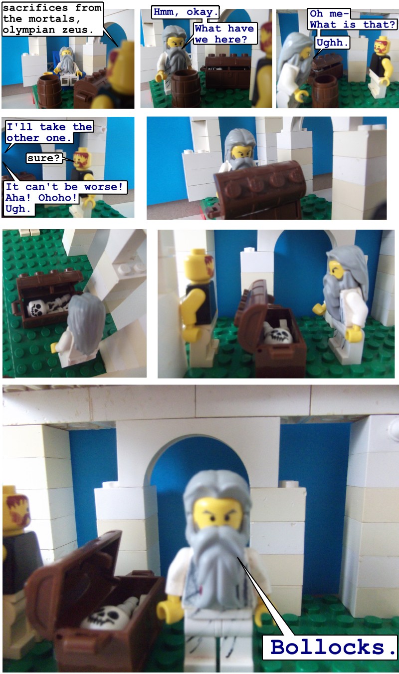 I don't have that problem. My problem is limitations in my Lego parts. So, rather than showing the meat disguised as organs, or appetising glistening fat (which I'm pretty sure are not standard Lego bricks), I had Zeus reject it on sight. This actually affects the interpretation quite a lot.